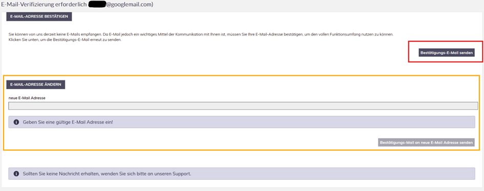 Neue Email Adresse eingeben und Bestätigung schicken lassen